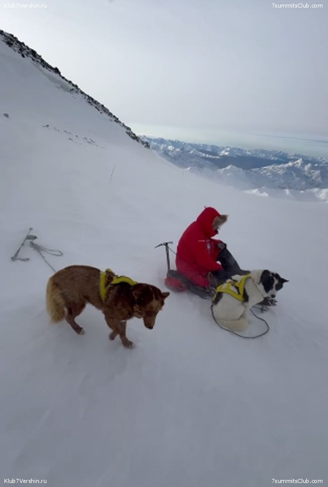 В результате команда из трех собак и трех альпинистов взошла с высоты 5100 метров на вершину за 3,5 часа. Примечательно что эти собаки зимой таскают упряжки, но ни разу не были в горах. То есть у них Эльбрус первая вершина в их собачей жизни. Погода была ужасная. После вершины спускались в пургу и ветер 50 км в час.