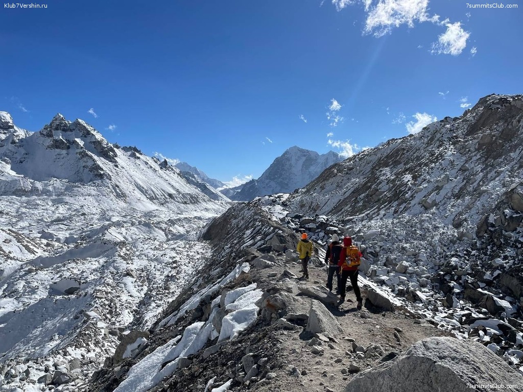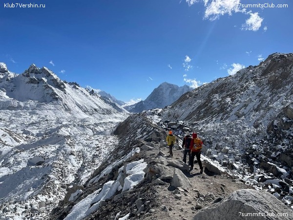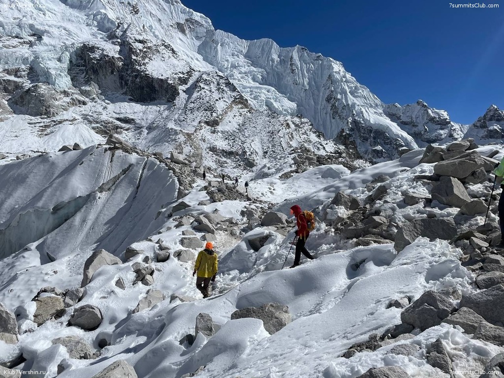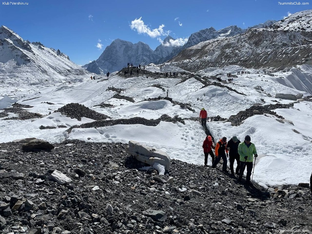 Дойдя до заветного камня, обозначающего вход в базовый лагерь, мы сфотографировались и продолжили экскурсию по лагерю. Посмотрели, где Клуб 7 Вершин ставит свой лагерь - очень непривычно видеть эти мест без палаток, потом прошли дальше по леднику, чтобы как следует разглядеть ледопад Клумбу.