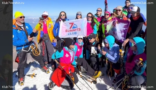 На вершине — шампанское, радость и гордость за себя. А рядом — неизменный наставник и вдохновитель Александр Абрамов и команда Клуба 7 Вершин. 100% состава — на вершине! В этот день на склонах Эльбруса было около 400 человек, и даже очередь перед вершиной не остановила наших девушек — они стояли вместе, как единая команда.