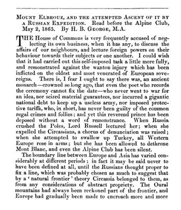 Есть такое выражение «англичане сделали Альпы Альпами». По отношению к Кавказу этого не скажешь. Если кто что серьезное и сделал с Кавказом, то это большевики и комсомольцы. Об этом в другой раз. Пока надо отдать должное англичанам: альпинистское освоение Большого Кавказа началось всё же с них. И тут выпишем благодарность Преподобному (то есть, в звании священника англиканской церкви), профессору, выдающемуся историку Херфорду Джорджу. Это он подготовил доклад, зачитал его перед членами Альпийского клуба, а затем опубликовал его в ежегоднике Alpine Journal.