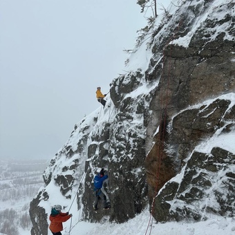 Выезд на скалы: отработка дюльфера, подъем по перилам при помощи жумара, лазание с верхней страховкой. Занятия по станциям страховки.