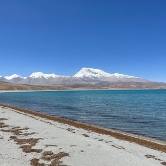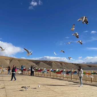 Тибета, расположенному на высоте 4400 метров. Панорамные виды озера,